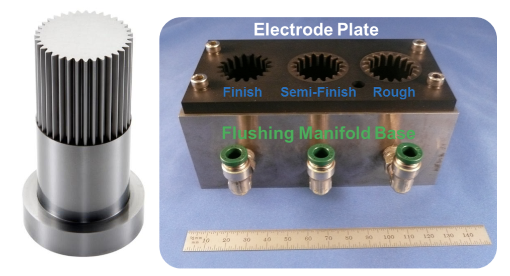 If high accuracy is desired on straight-wall spline gears, you’ll need different sized electrodes for Rough and Finish operations. The Finishing electrode will have a smaller electrode reduction amount and will be closer to the final target net-shape geometry, so the final results will have less distortion. It might also be necessary to adjust and slow down the orbit speed to finish gear forms with more precision and consistent surface finish results. The electrodes for straight-wall spline gears are most commonly produced by Milling or by Wire EDM depending on detail size. Internal gear forms require a punch-like electrode to be made, while external gear forms are usually made from a plate electrode.