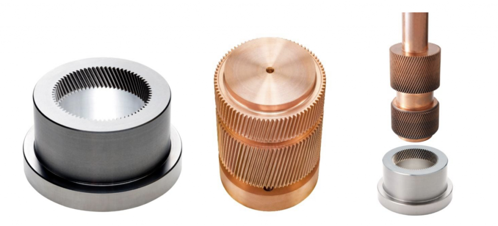 In creating a true radial gear form, a Sinker EDM will utilize (x2) axes that are controlled together simultaneously to produce a precise radial twist. These programs most often use the combined positioning of the C & Z Axes together to produce a radial form (the electrode is rotated). It’s also possible to produce helixed geometry using X & C Axes together in a similar method to Roll-Forming (the work piece is rotated), but the electrode design requirements are different.