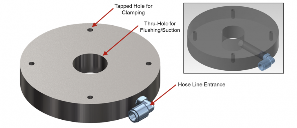 Flush Pots and Flush Manifolds are work-holding fixtures that are simple to make and are usually made in-house from a tool steel and customized for a specific job need, such as for the part size and depth requirements. Flush Pots are bolted to the machine table or placed on a magnetic chuck. They’ll contain a series of tapped holes to clamp down the work piece. Flush Manifolds are typically more customized, and can have separate compartments that require different flushing applications.