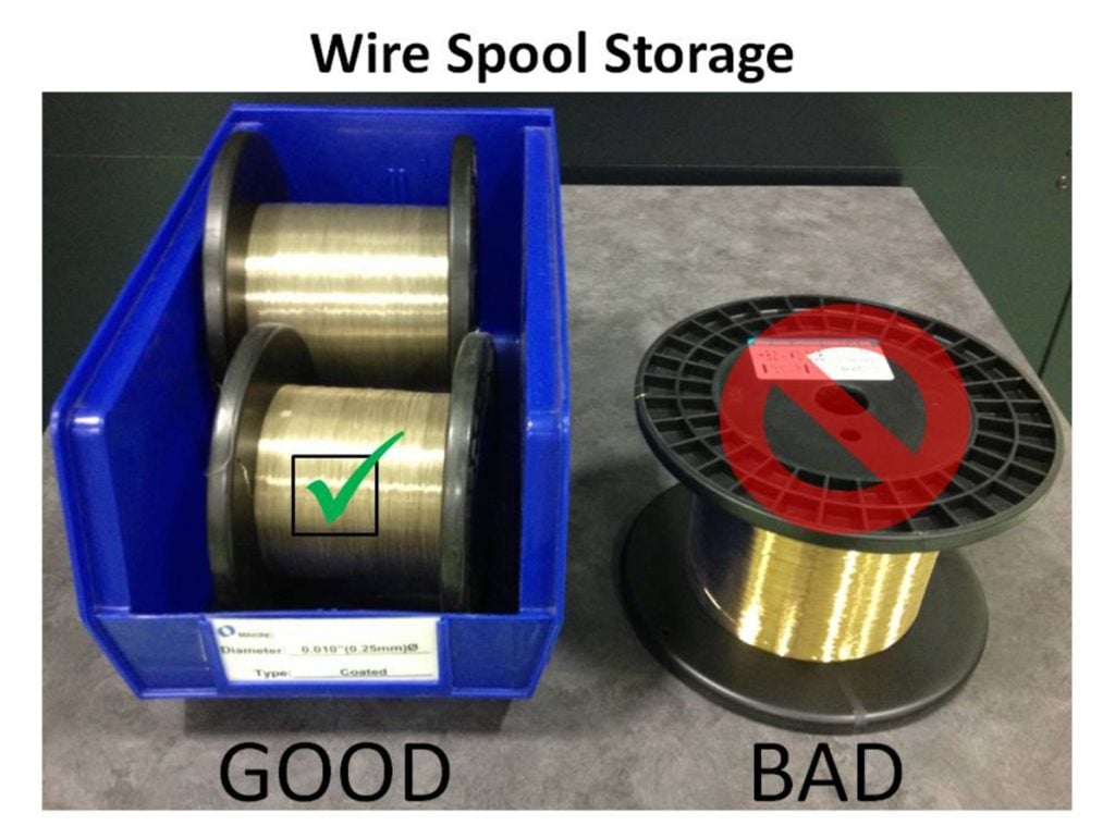 When storing new or partially used wire spools, they should not be stored with the wire laying horizontally (laying on the spool flanges). It is common to store a spool by laying it on the flanges so that the spool does not roll away; however, this can loosen the wire on the spool or cause the wire to unwrap and become looped underneath itself.
